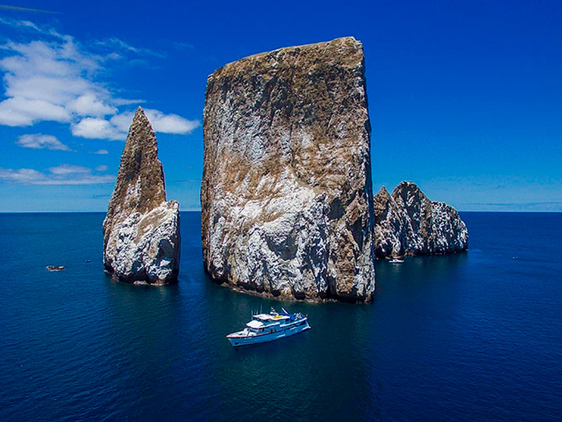 – Kicker Rock: Kicker Rock (Leon Dormido) is the remains of a lava cone eroded by the sea, the two vertical rocks rising 500 feet from the ocean form a small channel that is navigable by small boats. Many sea birds can be seen here.