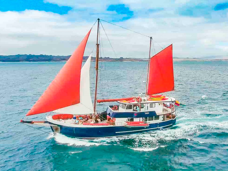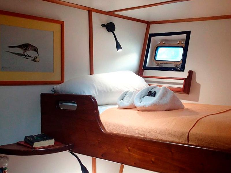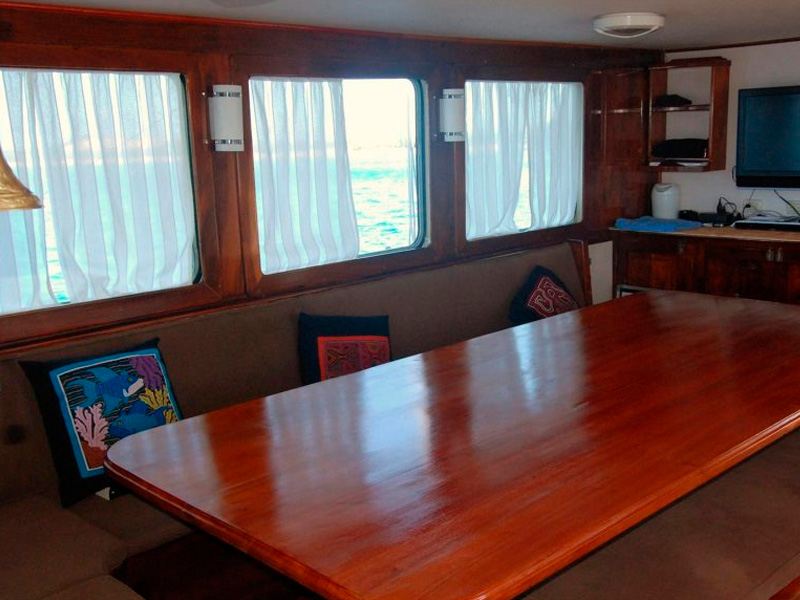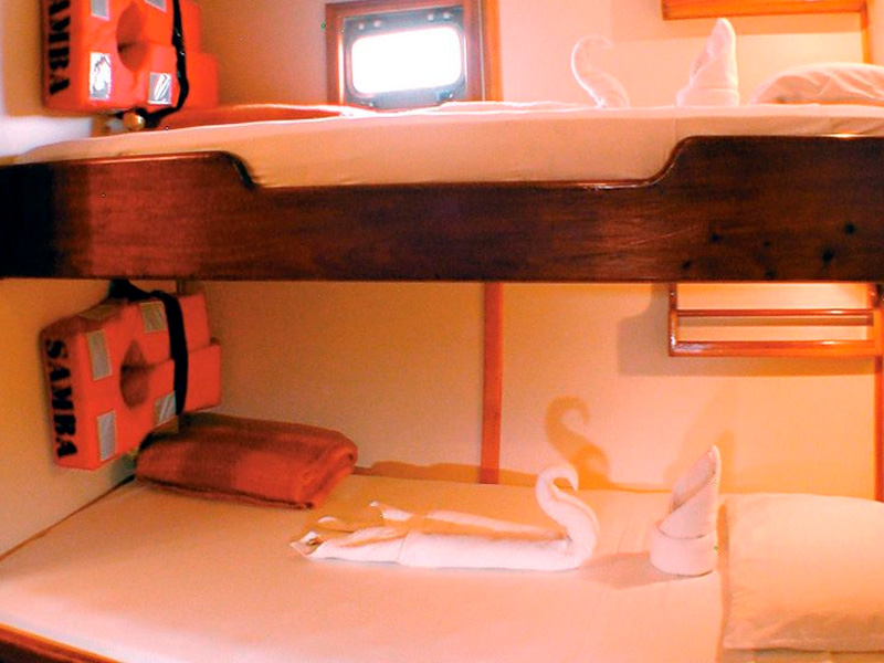 The Samba is a true European Dutch classic and a stately and comfortable Galapagos sailing vessel. Guests will be pleasantly accommodated in seven double rooms, six with air-conditioning, and each with private facilities and hot water. An ample dining room/salon connects to an outdoor dining facility with large tables, a TV and video system, sound system, mini library of books and videos, and a small bar. The Samba is a graceful, top-quality craft; she is as environmentally friendly as she is socially responsible. She is locally owned, and the entire crew is devoted to making your journey the trip of a lifetime.